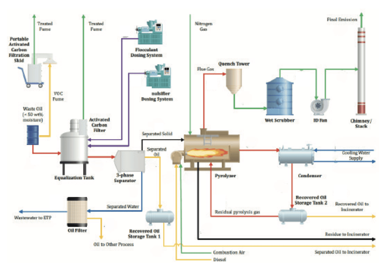 To safeguard environmental compliance, the plant integrates a wet scrubber-based air pollution control system, local exhaust ventilation with activated carbon filtration, and a Continuous Emission Monitoring System (CEMS) aligned with DOE Clean Air Regulations 2014. Designed to operate 7,920 hours per year, the facility is capable of treating waste oils with up to 50% water content, consistently producing recovered oil that meets the DOE Guidelines on Recovered Waste Oil (2010).